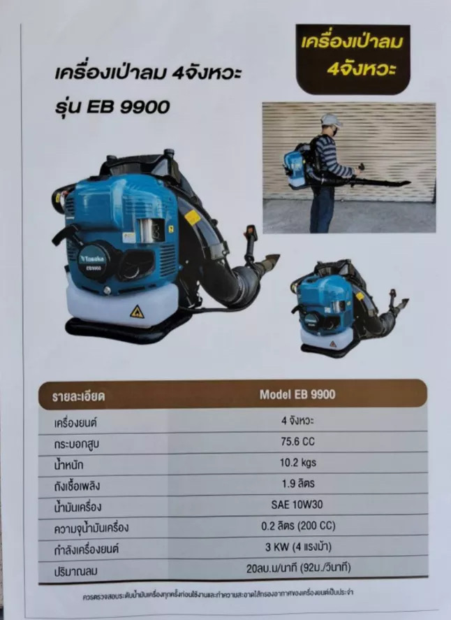ชื่อสินค้า : เครื่องเป่าใบไม้แบบสะพายหลัง 4 จังหวะ เครื่องยนต์ 75.6 CC. TOSAKA มาตรฐานญ๊๋ปุ่น ราคาโรงงาน