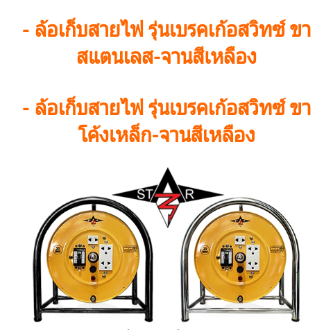 ล้อเก็บสายไฟ รุ่นเบรคเก้อสวิทซ์ ขาสแตนเลส-ขาโครงเหล็ก (จานเหลือง)